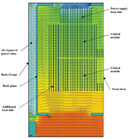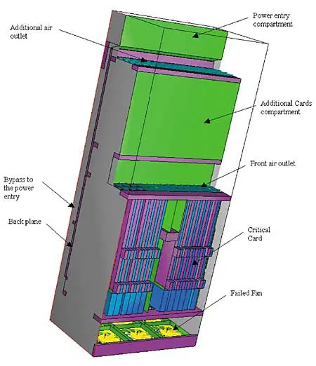 After the “semi-exact” models of the cards were verified, an exact model of the cage was built (Figure 2). This cage, fully equipped with 100W cards, was then analyzed with and without fan failure. As it is seen in Figure 2, the cage consists of several compartments: