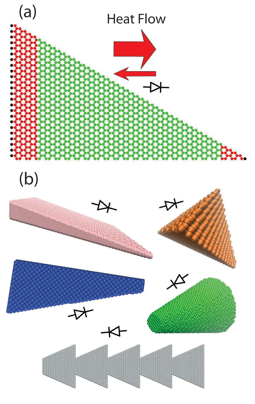 Thermal rectification, in addition to being present in the graphene triangular structures, can also be seen in other “asymmetric nanostructure materials” including thin films, pyramidal quantum dots, nanocones and triangles, say the researchers. These structures can be linked to produce larger structures and better rectification performance. Once perfected, the concept could be used to control heat flow in a number of fields, including computers and electronics, clothing and buildings.